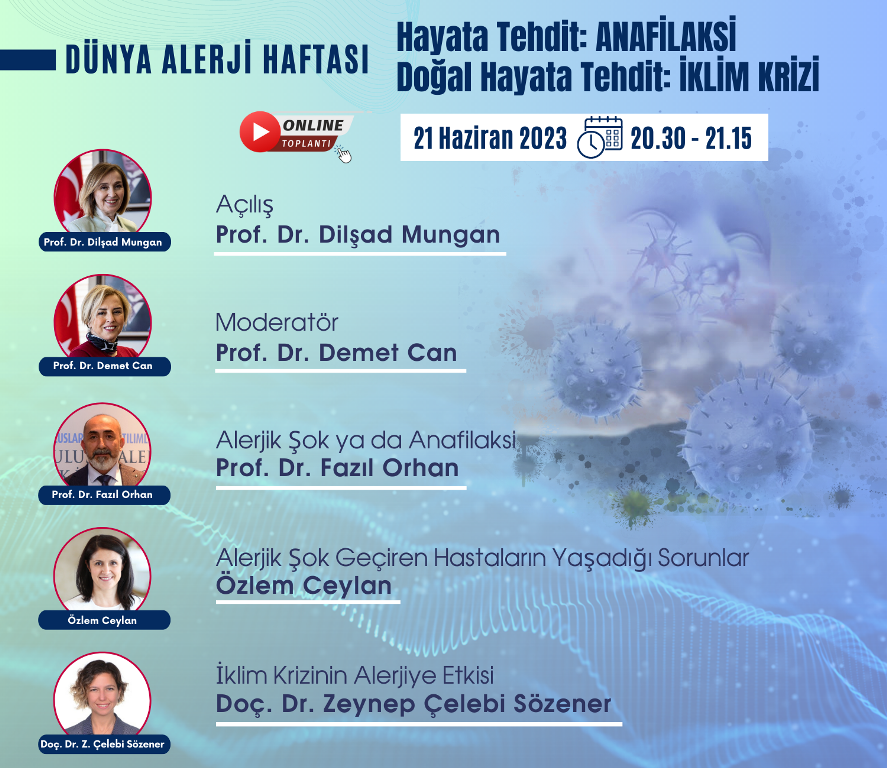Bu kapsamda, alerji konusunda toplumda farkındalık oluşturmak amacıyla her yıl bir dizi projeyi hayata geçiren Türkiye Ulusal Alerji ve Klinik İmmünoloji Derneği (AİD) bu yıl da 18-24 Haziran 2023 tarihinde kutlanacak iklim değişikliğinin alerjik hastalıklar üzerindeki etkisini konu alan Dünya Alerji Haftası'nda önemli bir semineri hayata geçiriyor. Hayata Tehdit: Anafilaksi, Doğal Hayata Tehdit: İklim Değişikliği başlığıyla AİD'in Youtube hesabı üzerinden 21 Haziran Çarşamba günü saat 20:30'da Alerji ile Yaşam Derneği ortaklığıyla gerçekleştirilecek canlı yayında alerji-klinik immünoloji doktorları, hastalarının tetikleyicileri belirlemesine, semptomların kötüleşmesini önlemesine ve ortamlarındaki değişiklikler arasında yaşam kalitesini korumasına yardımcı olacak önemli bilgileri paylaşacaklar. Artan bu endişeyle nasıl yüzleşecekleri konusunda hem hastalara hem de politika yapıcılara uygun tavsiyeler verecekler.İklim değişiklikleri alerjen maruziyetini nasıl artırabilir İklim değişikliklerinden en çok kim zarar görüyor ve İklim değişikliklerinin tehlikelerini nasıl azaltabiliriz gibi sorulara yanıtların aranacağı VEM İlaç'ın koşulsuz desteği ile gerçekleşecek seminer, AİD Başkanı Prof. Dr. Dilşad Mungan'ın açılış konuşmalarıyla başlayacak. AİD Başkan Yardımcısı Prof. Dr. Demet Can'ın moderatörlüğünde gerçekleşecek yayında Prof. Dr. Fazıl Orhan, Alerjik Şok ya da Anafilaksi konusunu, Alerji ile Yaşam Derneği Yönetim Kurulu Başkanı Özlem Ceylan Alerjik şok geçiren hastaların yaşadığı sorunlar konusunu, Doç. Dr. Zeynep Çelebi ise İklim Krizinin Alerjiye Etkisi konusunu anlatacak.