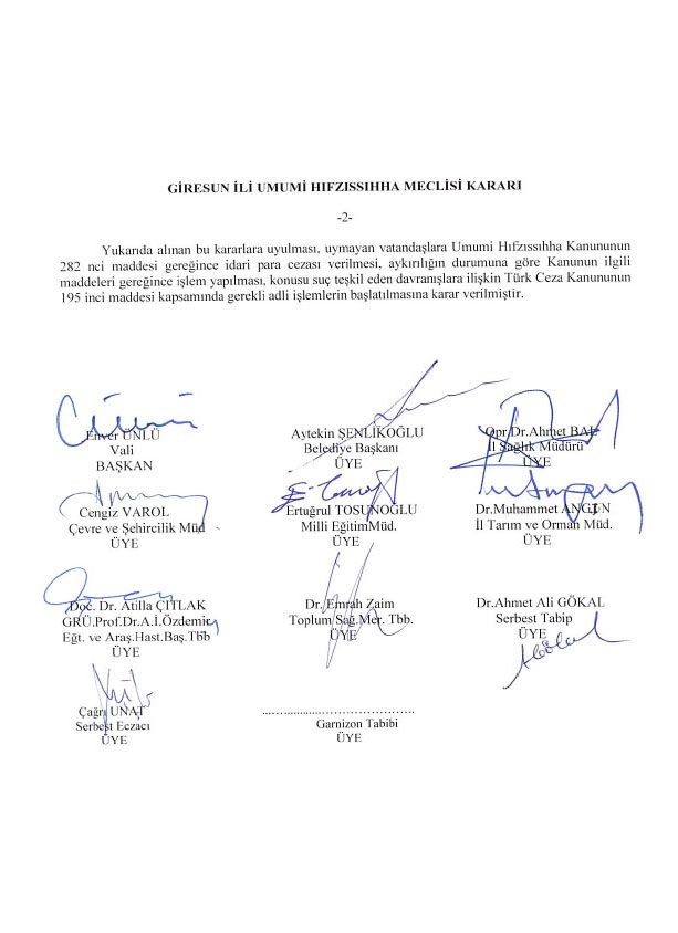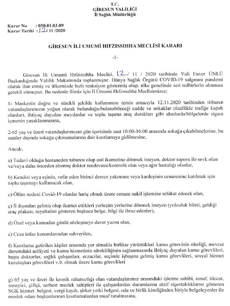 2020/306 Giresun İl Umumi Hıfzıssıhha Meclisi Kararı, Giresun İli Umumi Hıfzıssıhha Meclisi, 12/ 11 / 2020 tarihinde Vali Enver ÜNLÜ Başkanlığında Valilik Makamında toplanarak ekteki kararları almıştır.