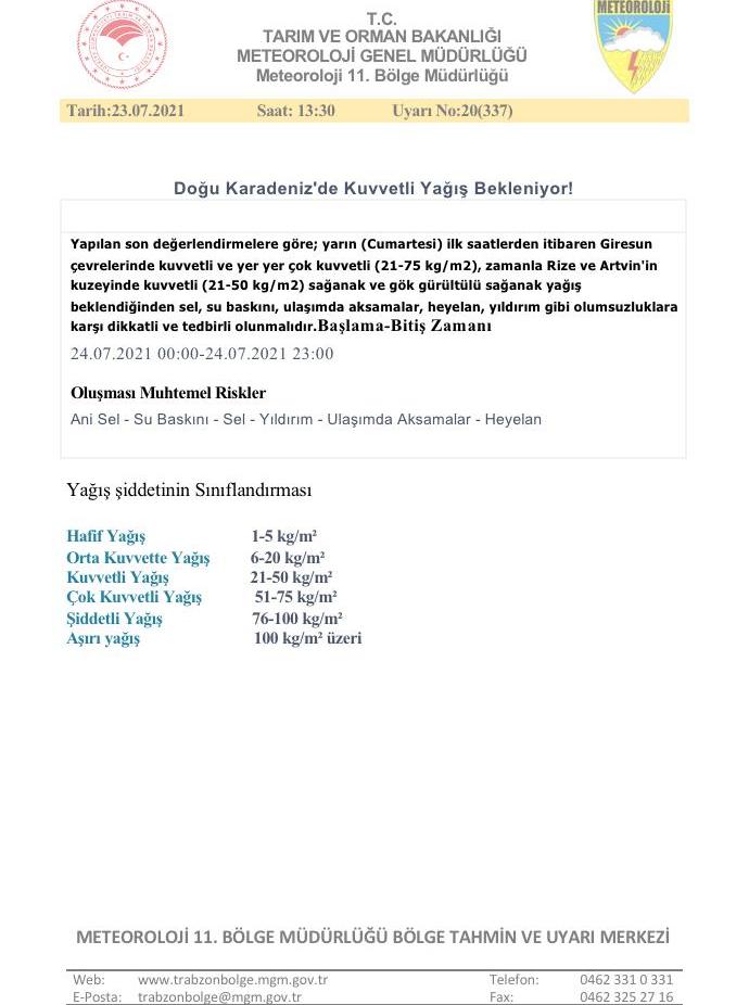 Son yapılan değerlendirmelere göre, yarın ilk saatlerinden itibaren Giresun çevresinde kuvvetli ve yer yer çok kuvvetli (21-75 kg/m2), zamanla Rize ve Artvin'in kuzeyinde kuvvetli (21-50 kg/m2 gök gürültülü ve sağanak yağış beklendiğinden sel, su baskını, yıldırım, heyelan ve ulaşımda aksamalar gibi olumsuzluklara karşı dikkatli ve tedbirli olunması gerekmektedir.