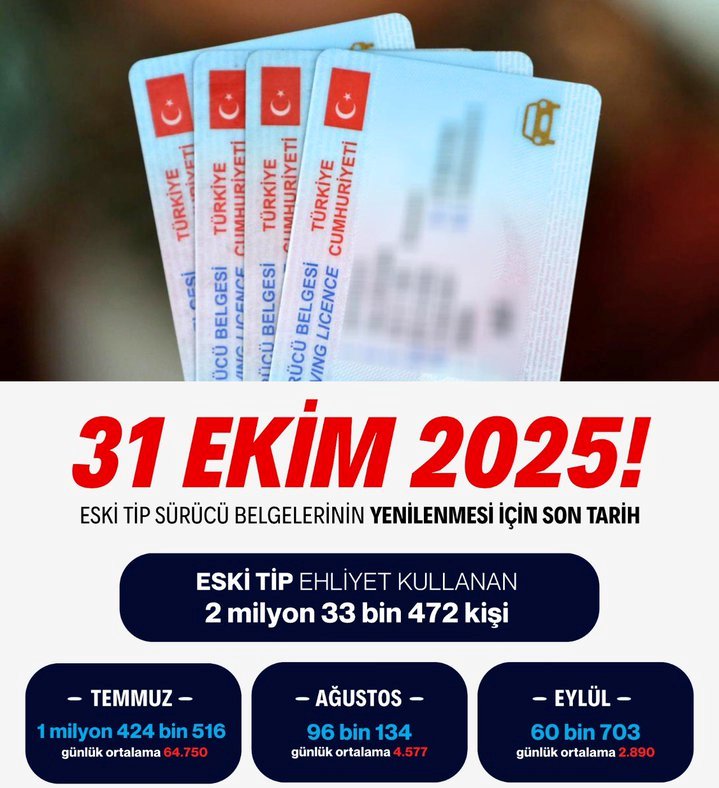 Eski tip SÜRÜCÜ BELGELERİNİN yenilenmesi için SON TARİH, 31 Ekim 2025