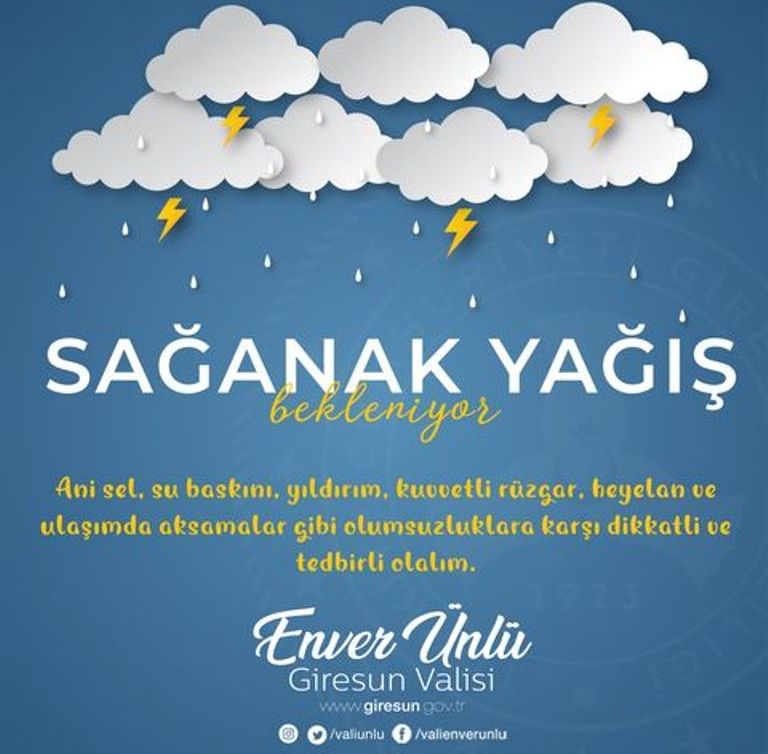Giresun Valisi Enver Ünlü, 13 Ağustos Cuma günü Giresun ve çevrelerinde beklenen gök gürültülü sağanak yağışlara karşı vatandaşları uyardı.