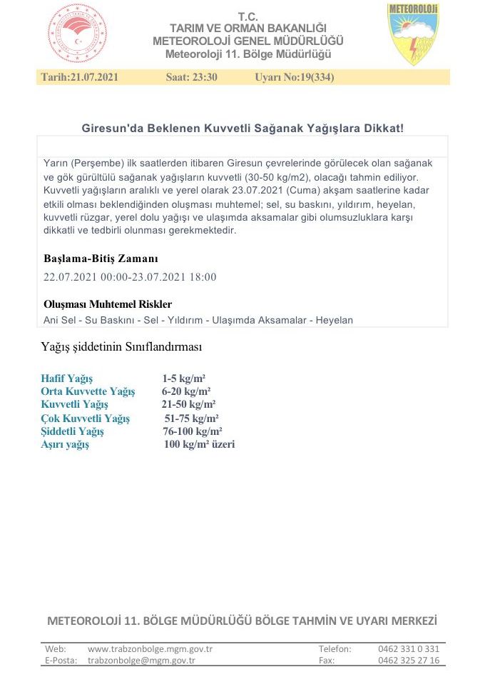 Son yapılan değerlendirmelere göre, yarın ilk saatlerinden itibaren Giresun çevresinde görülecek olan sağanak ve gök gürültülü sağanak yağışların kuvvetli (30-50 kg/m2) olacağı tahmin ediliyor. Kuvvetli yağışların aralıklı ve yerel olarak 23.07.2021 Cuma akşam saatlerine kadar etkili olması beklendiğinden oluşması muhtemel sel, su baskını, yıldırım, heyelan, kuvvetli rüzgar, yerel dolu yağışı ve ulaşımda aksamalar gibi olumsuzluklara karşı dikkati ve tedbirli olunması gerekmektedir.