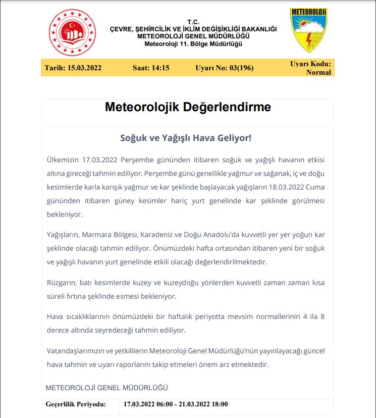 Ülkemizin 17.03.2022 Perşembe gününden itibaren soğuk ve yağışlı havanın etkisi altına gireceği tahmin ediliyor. Perşembe günü genellikle yağmur ve sağanak, iç ve doğu kesimlerde karla karışık yağmur ve kar şeklinde başlayacak yağışların 18.03.2022 Cuma gününden itibaren güney kesimler hariç yurt genelinde kar şeklinde görülmesi bekleniyor.