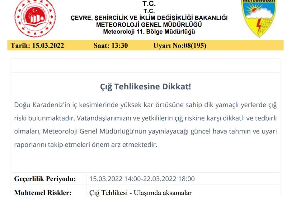 Doğu Karadeniz'in iç kesimlerinde yüksek kar örtüsüne sahip dik yamaçlı yerlerde çığ riski bulunmaktadır.