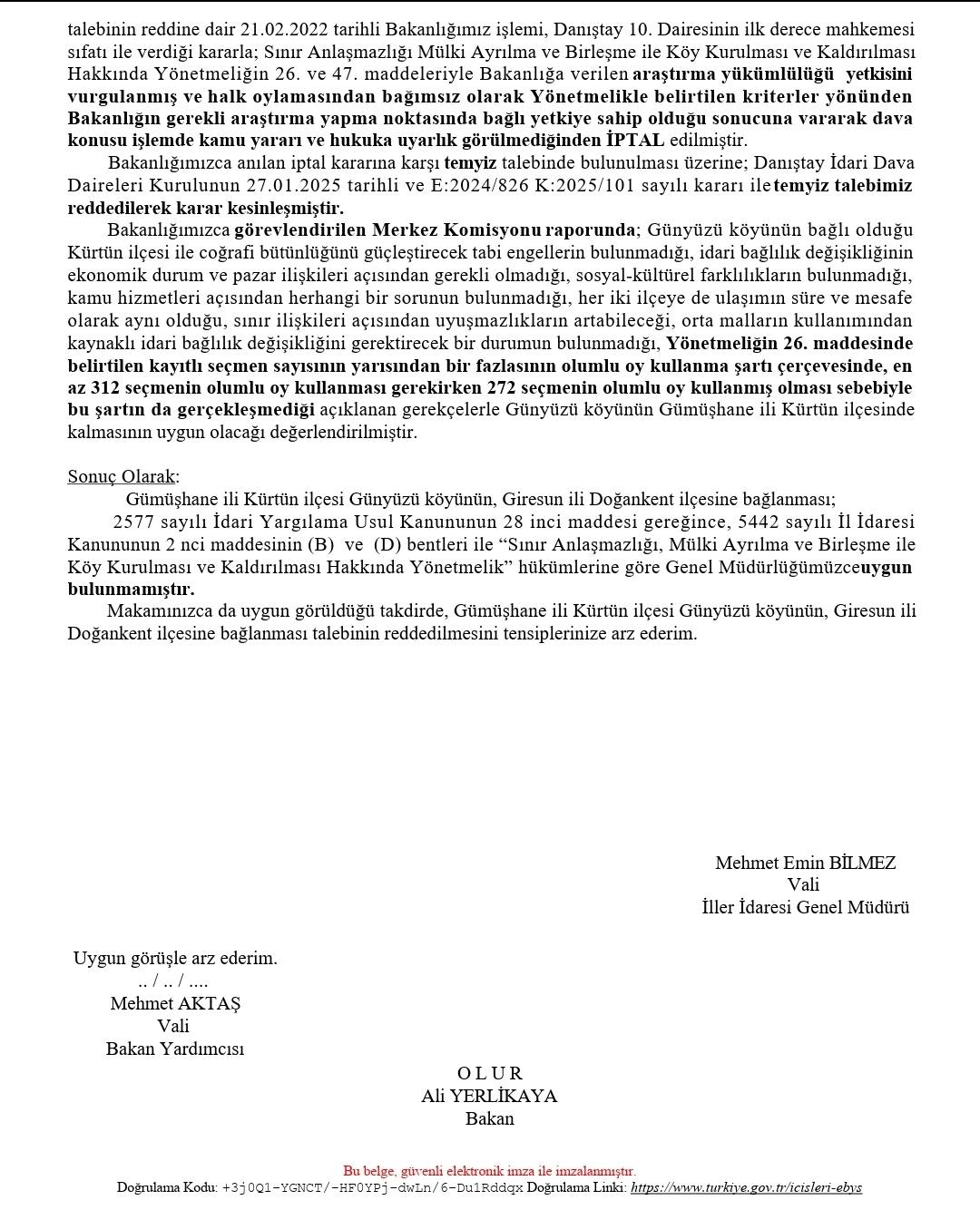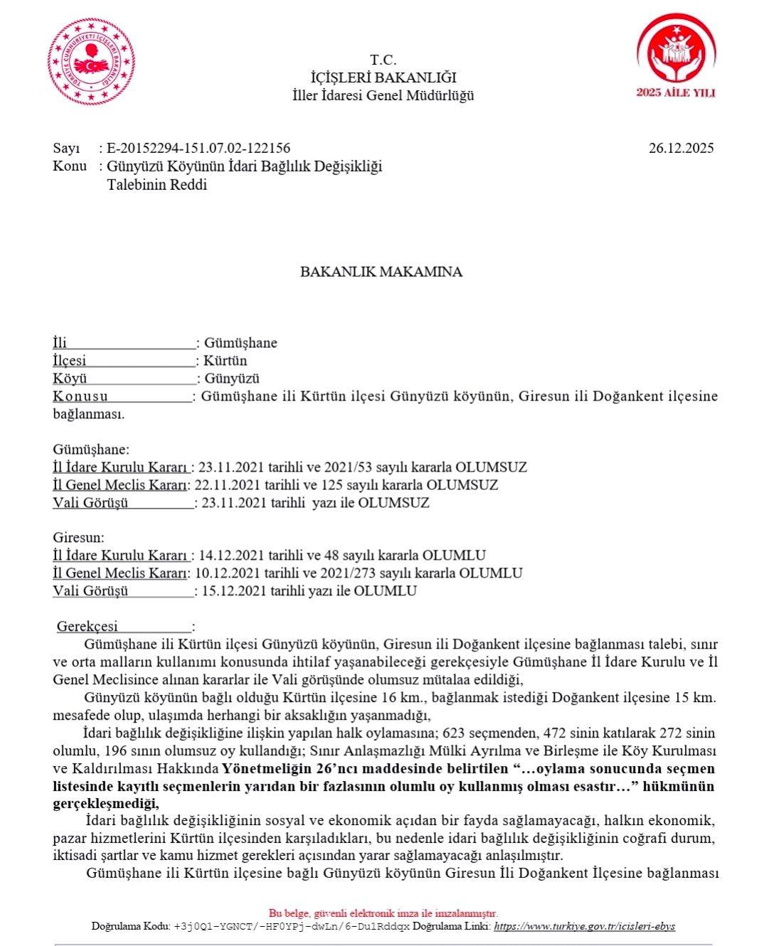 Gümüşhane'nin Kürtün ilçesine bağlı Günyüzü Köyü'nün, uzun yıllardır sürdürdüğü Giresun’un Doğankent ilçesine bağlanma talebi, İçişleri Bakanlığı tarafından bir kez daha reddedildi.
