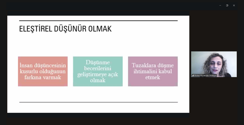 Seminer dizisinin açılışını yapan Üsküdar Üniversitesi Yeni Medya ve İletişim (İngilizce) Bölüm Başkanı Doç. Dr. Bahar Muratoğlu Pehlivan, Eleştirel Düşünme Becerileri: Zihnimizin Tuzaklarını Tanımak başlıklı sunumunda, bilgi kirliliğinin yoğun olduğu günümüzde hayati bir önem taşıyan Eleştirel Düşünme kavramını derinlemesine ele aldı