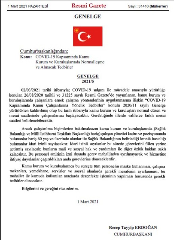 Resmi Gazete'nin 1 Mart 2021 Pazartesi tarihli 31410 (Mükerrer) sayısında COVID-19 Kapsamında Kamu Kurum ve Kuruluşlarında Normalleşme ve Alınacak Tedbirler konulu 2021/5 nolu Cumhurbaşkanlığı genelgesi ile COVID-19 salgını ile mücadele amacıyla yürürlüğe konulan 26/08/2020 tarihli ve 31225 sayılı Resmi Gazete'de yayımlanan, kamu kurum ve kuruluşlarında çalışanlara esnek çalışma yöntemlerinin uygulanmasına ilişkin COVID-19 Kapsamında Kamu Çalışanlarına Yönelik Tedbirler konulu 2020/11 sayılı Cumhurbaşkanlığı Genelgesi yürürlükten kaldırıldı.