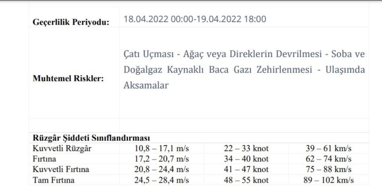 Meteorolojiden yapılan uyarıya göre, Kuvvetli Rüzgâr ve Fırtınaya Dikkat, Rüzgârın güney ve güneybatı yönlerden kuvvetli (40-60 km/saat), hamleli olarak ve yüksek kesimlerde kısa süreli fırtına (70-80 km/saat) şeklinde eseceği tahmin ediliyor. Ulaşımda aksamalar, çatı uçması, ağaç ve direk devrilmesi, soba ve doğalgaz kaynaklı zehirlenmeler gibi olumsuzluklara karşı dikkatli ve tedbirli olunmalıdır.