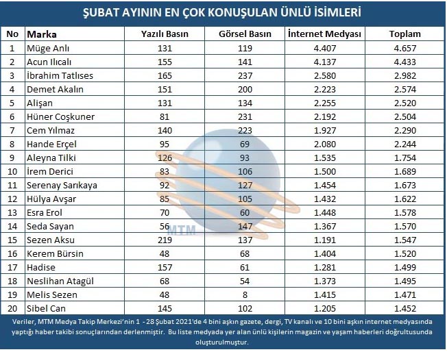 MTM'nin Şubat ayını kapsayan araştırmasında öne çıkan magazin olayları ve ayın popüler ünlüleri belirlendi. Televizyon programları Şubat ayı magazin gündemini büyük ölçüde etkiledi. Müge Anlı, Şubat ayı magazin gündeminin en çok konuşulan ismi olurken, onu Acun Ilıcalı ve İbrahim Tatlıses takip etti.