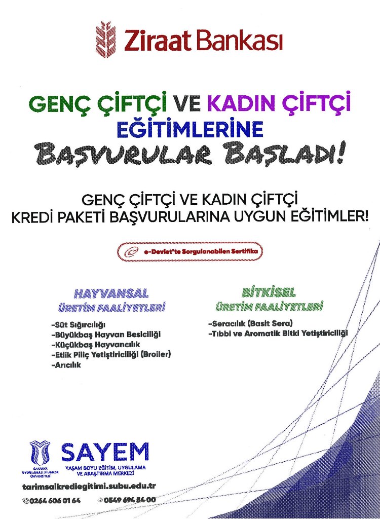 2022 Yılında tarımsal faaliyetlerin desteklenmesi adına kadın ve genç çiftçilerimize T.C. Ziraat Bankası tarafından 500.000 TL'ye kadar yüzde 10 özkaynak katkısı ile kredi desteği verilecektir. Söz konusu kredi desteğinden faydalanmak için gerekli şartların içerisinde faaliyet konusu alanda eğitim sertifikası sahip olma şartı da yer almaktadır. Bu çerçevede Sakarya Uygulamalı Bilimler Üniversitesi Yaşam Boyu Eğitim Uygulama ve Araştırma Merkezi ve T.C. Ziraat Bankası ile yapılan protokole istinaden eğitim içerikleri oluşturulmuştur. Aşağıda belirtilen online sertifika programları açılmış, başvurular alınmaya başlanmıştır.